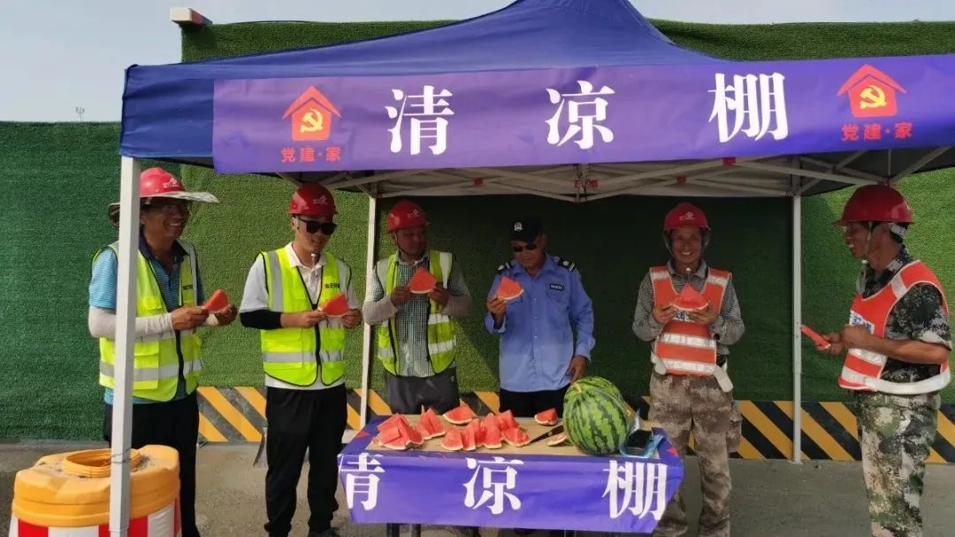 在公司迎賓大道二期快速化改造工程施工現場,“黨建·家”清涼棚出現在工地的多個角落,棚內常備西瓜、礦泉水、藿香正氣液等防暑降溫物品,來往的施工人員熱了渴了,來到棚內喝上幾口茶,吃上幾口瓜,消了暑繼續為項目建設貢獻自己的力量。