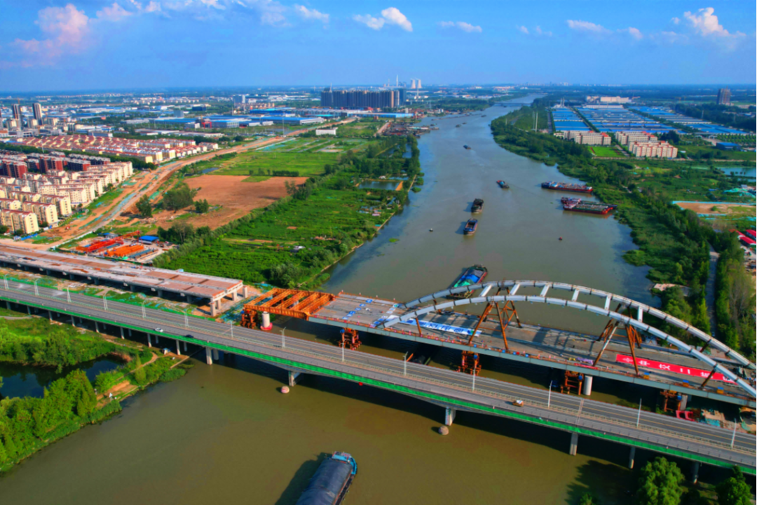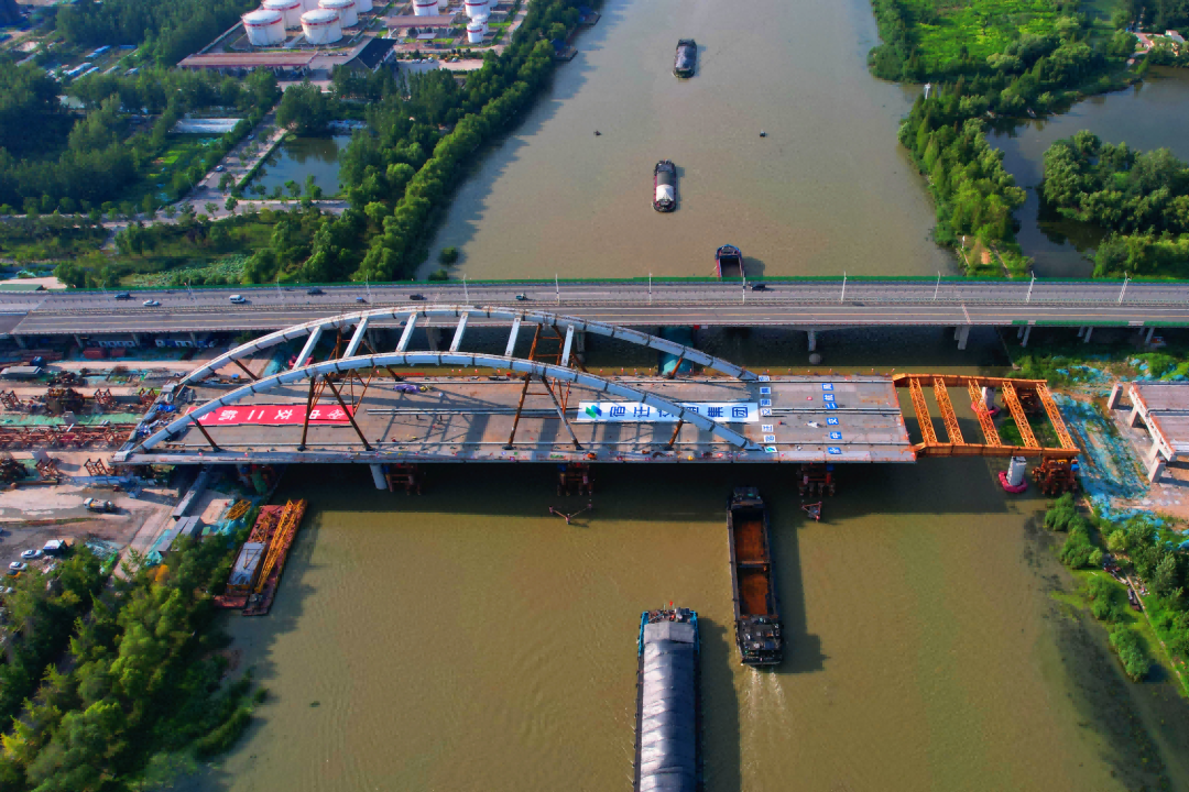 8月7日,北京路快速化改造工程的控制性工程——跨京杭運河特大橋完成百米沖刺,梁拱整體順利頂推過河。據悉,第二次頂推于7月29日正式啟動,共歷時10天,整體推進137米,累計頂推216米,頂推進度完成76.5%。