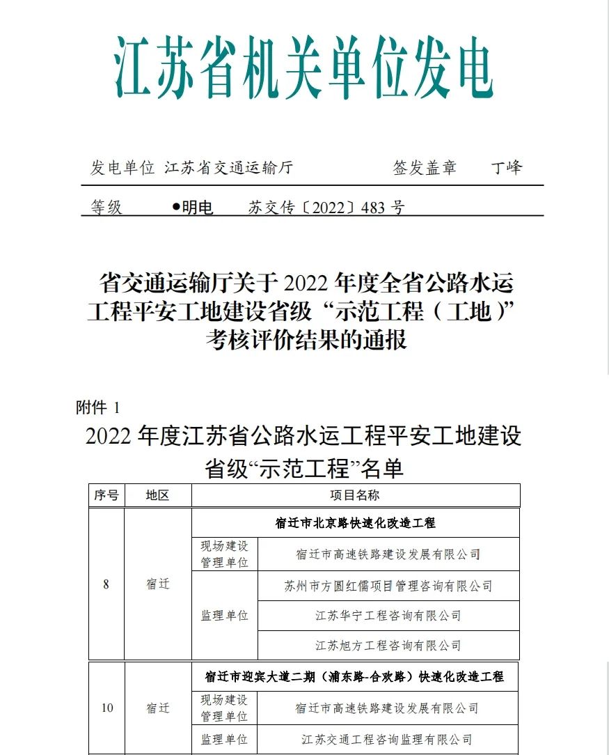近日,江蘇省交通運(yùn)輸廳對2022年度全省公路水運(yùn)工程平安工地建設(shè)省級“示范工程(工地)”名單進(jìn)行了公示,宿遷市北京路快速化改造工程、宿遷市迎賓大道二期(浦東路-合歡路)快速化改造工程2個(gè)項(xiàng)目獲評江蘇省公路水運(yùn)工程平安工地建設(shè)省級“示范工程”稱號。