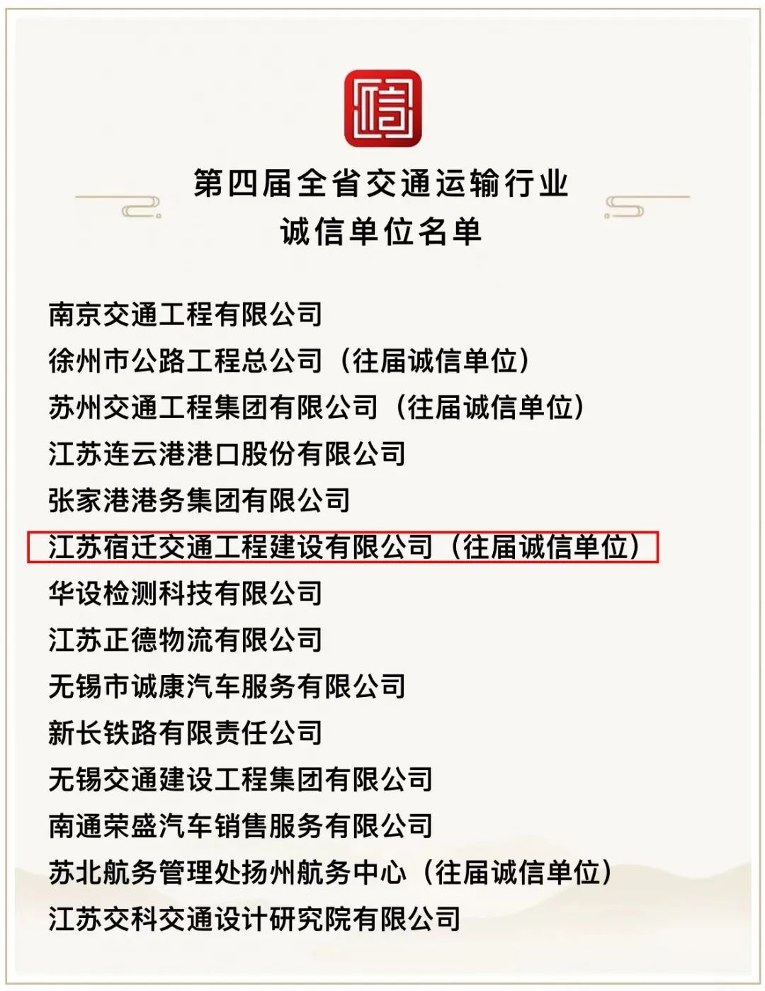 近日,江蘇省交通運輸廳公布第四屆(2021—2022年度)全省交通運輸行業誠信單位(集體)和誠信個人名單,宿遷交建位列其中。