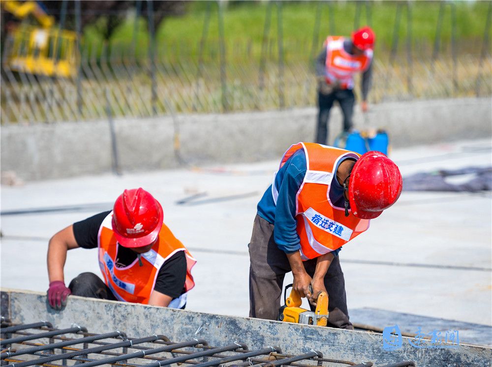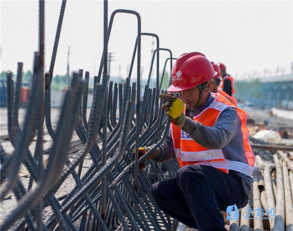 5月23日,在宿遷市港城路上跨鐵路專用線橋梁工程建設(shè)現(xiàn)場(chǎng),工人正在緊張施工,一派熱火朝天的景象。