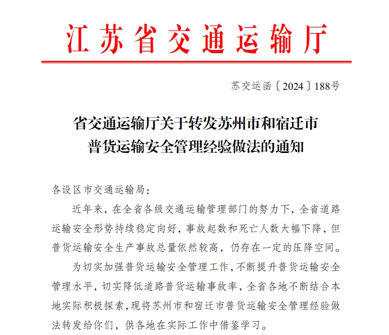 為切實加強普貨運輸安全管理工作,不斷提升普貨運輸安全管理水平,切實降低道路普貨運輸事故率,近日,省交通運輸廳將通湖物流園普貨運輸安全管理經驗做法在全省范圍內發文推廣,供各地在實際工作中借鑒學習。