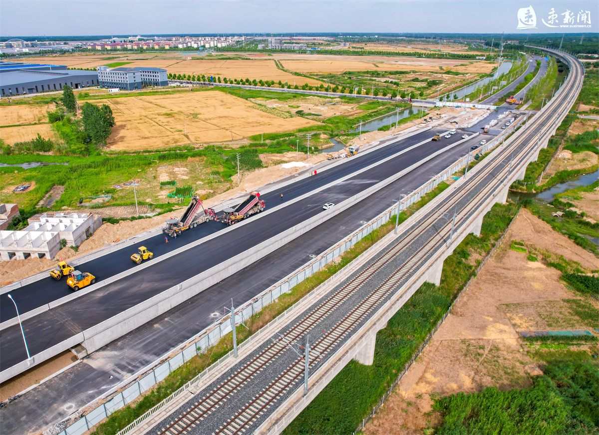 6月1日,在宿遷市港城路上跨鐵路專用線橋梁工程建設現場,工人正在緊張施工,大型機械來回穿梭,加快推進項目建設。