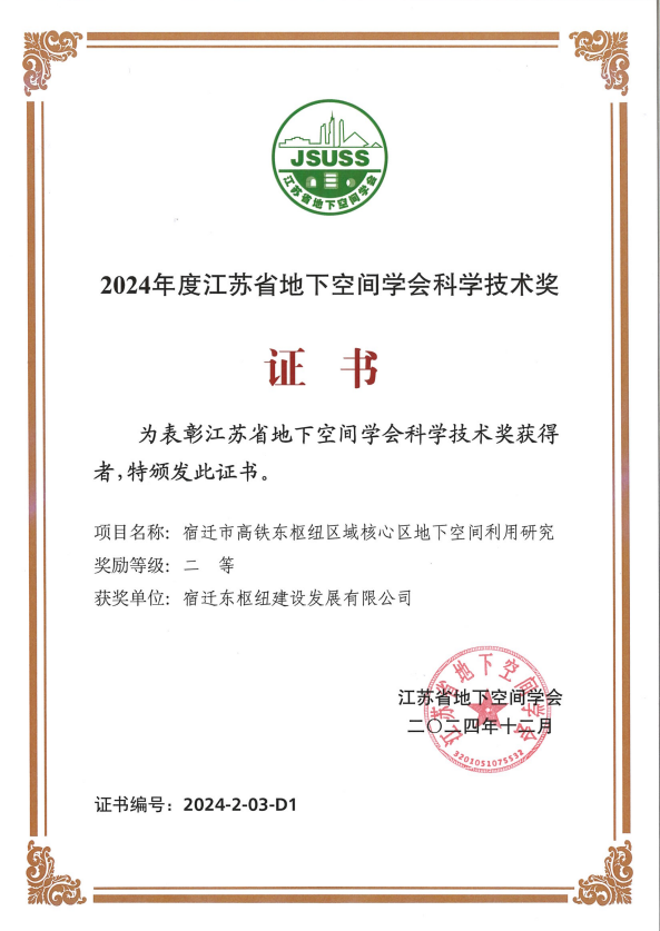 近日,江蘇省地下空間學會二屆二次理事會暨2024年度江蘇省地下空間學會科學技術獎頒獎表彰大會在南京召開,東樞紐公司的“宿遷市高鐵東樞紐區域核心區地下空間利用研究項目”榮獲二等獎。
