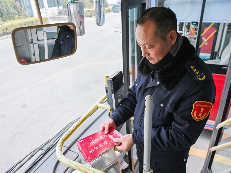1月24日,宿遷市公交車駕駛員手拿免費乘車投幣箱封口貼封閉投幣箱。為了滿足春節期間市民和游客的出行需求,營造溫馨便捷氛圍,鼓勵和倡導市民綠色出行,宿遷市所有城市公交、城鄉公交、鎮村公交于1月25日至2月4日期間免費乘坐。