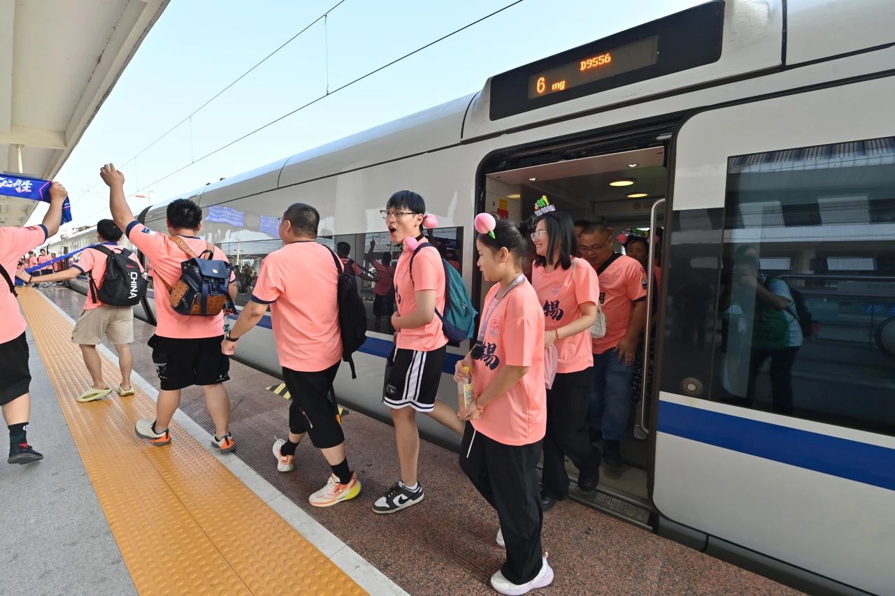 8月3日下午5點(diǎn)10分左右,載有700余名無(wú)錫球迷的D9556次專列抵達(dá)高鐵宿遷站。