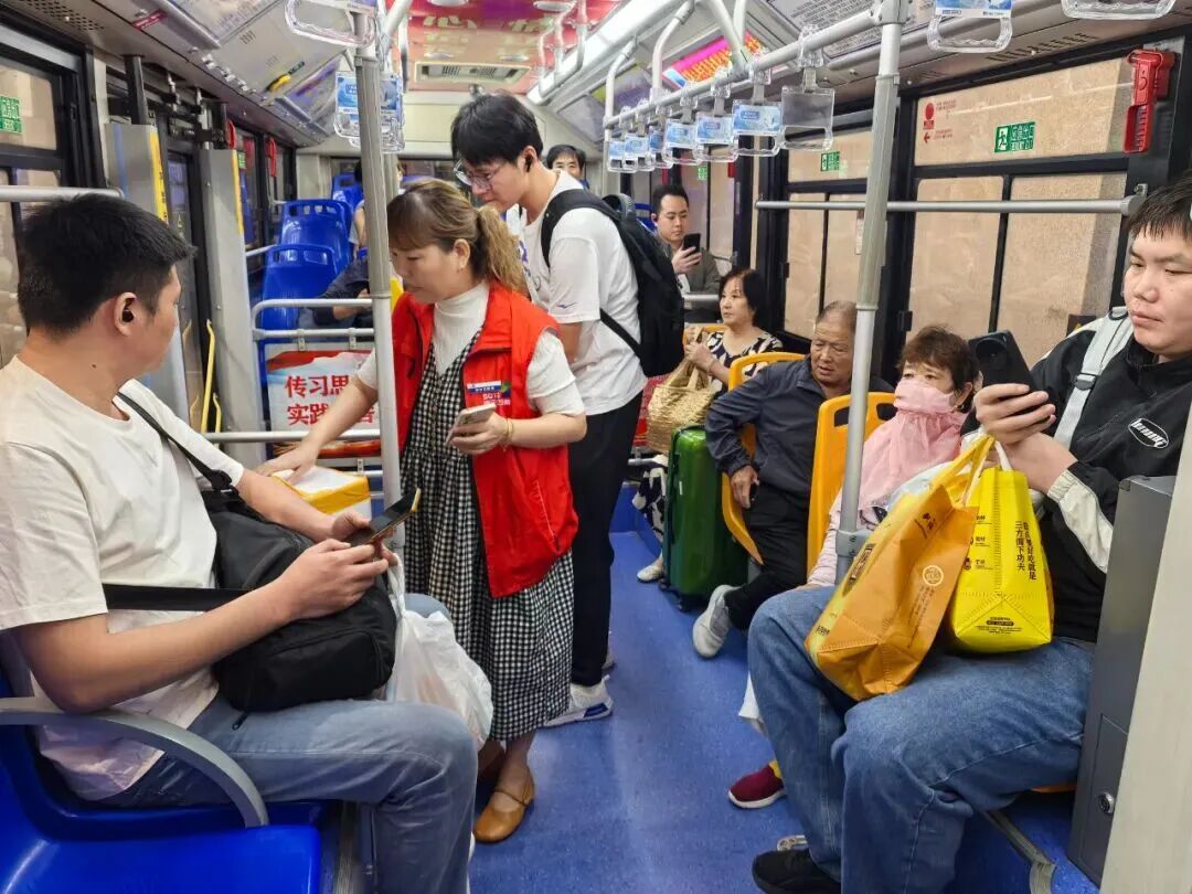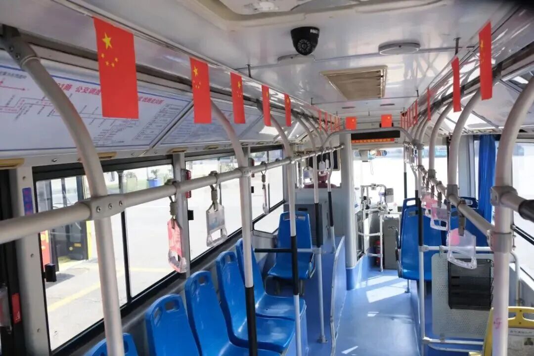 節日的車廂里,處處洋溢著濃厚的喜慶氛圍。301路公交車廂內,車頂兩側整齊懸掛著鮮艷的五星紅旗,微風拂過,紅旗輕輕搖曳,乘客們剛踏上車廂,目光便被這抹亮眼的中國紅吸引,孩子們指著紅旗興奮地向家長提問,車廂內滿是歡聲笑語,節日的幸福感在流動中不斷傳遞。