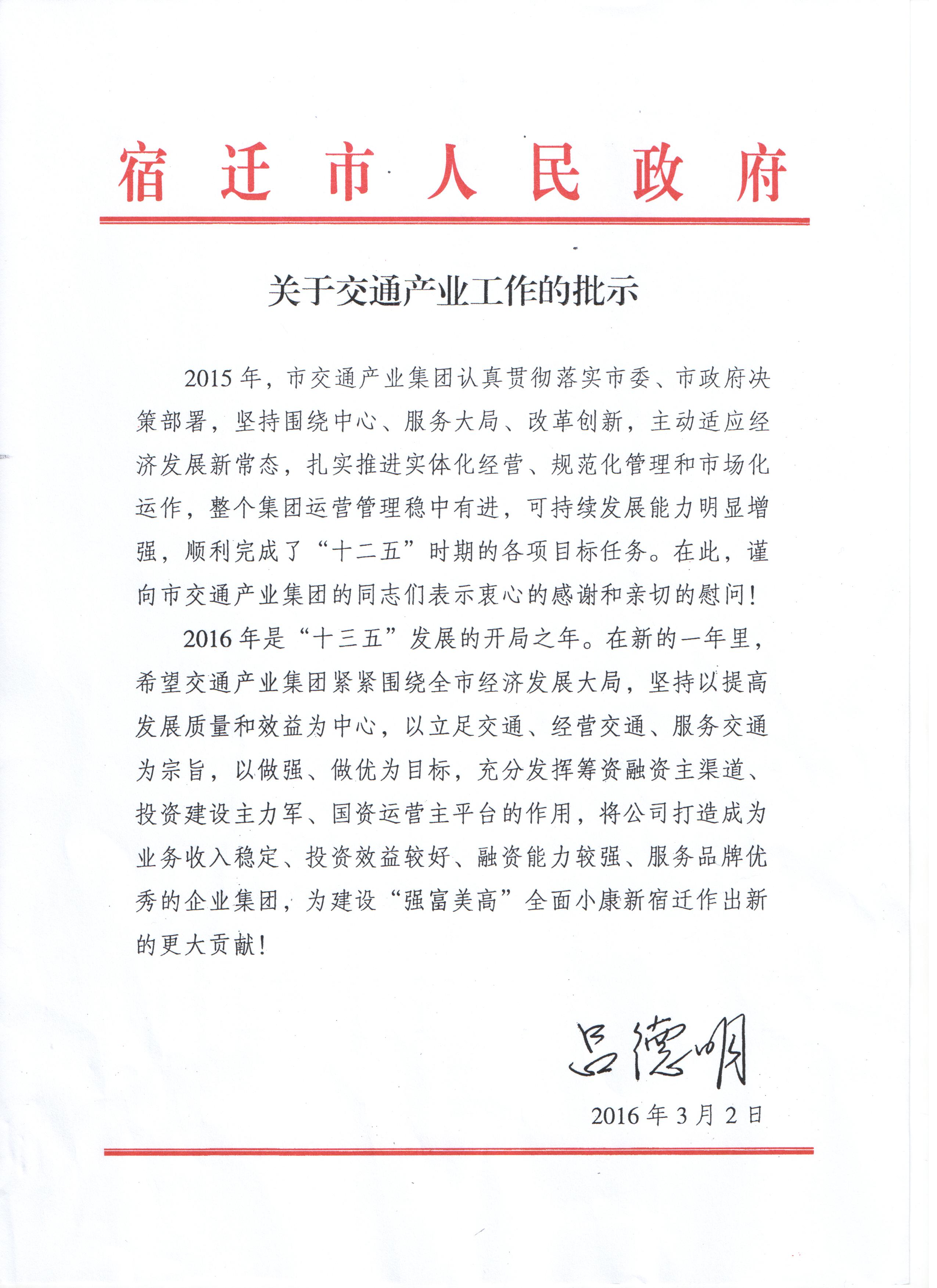 市委常委、常務副市長呂德明關于交通產業工作的批示